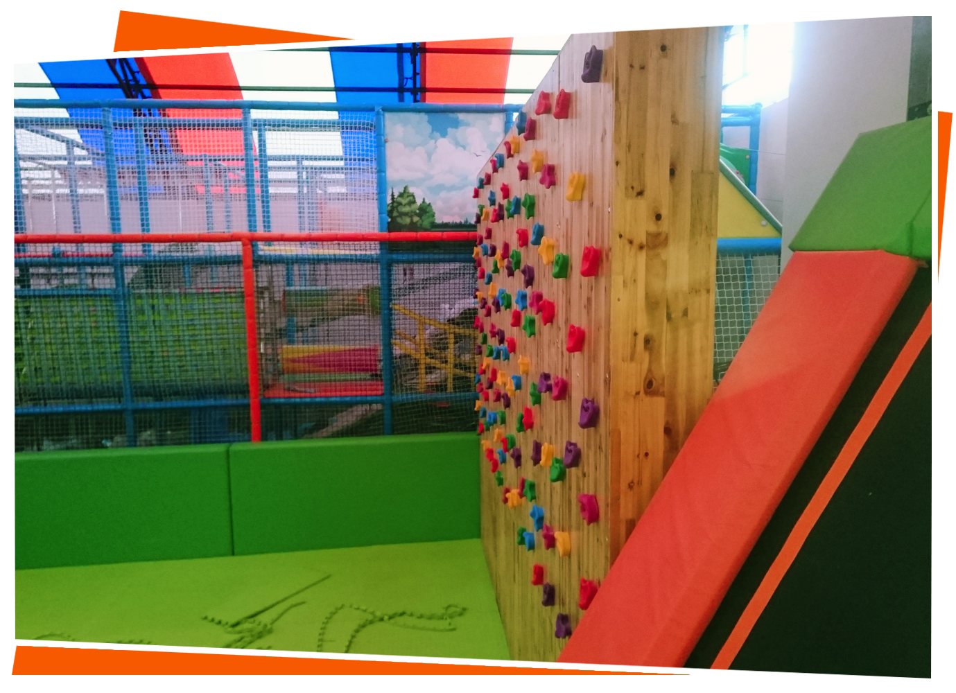 Esto otro gran reto, un muro donde los jugadores están sobre piscina de bloques de espuma, y han de hacer un recorrido en lateral, utilizando únicamente las presas de escalada. Esto es difícil para mucha gente. Pero muy divertido.